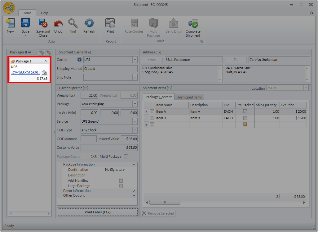 In the shipment transaction form, click on the Get Label button or press F12 to generate the shipment label. Upon generating the label, notice that the shipping rate reflected is the same as the rate indicated in the Freight Quote form of the sales order.