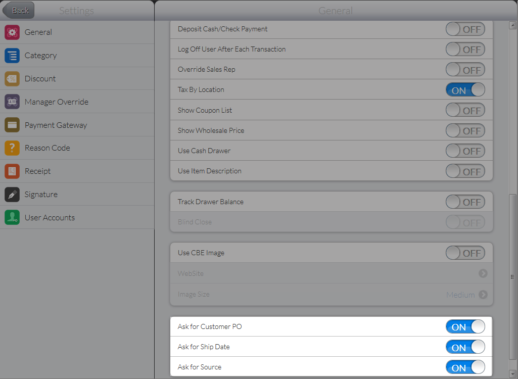 - At the bottom section of the page, tap ON any or all of the following options: Ask for Customer PO, Ask for Ship Date, Ask for Source.