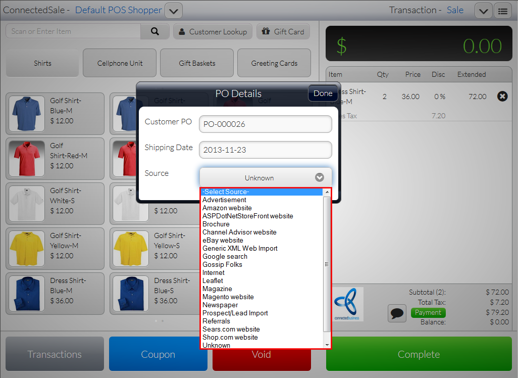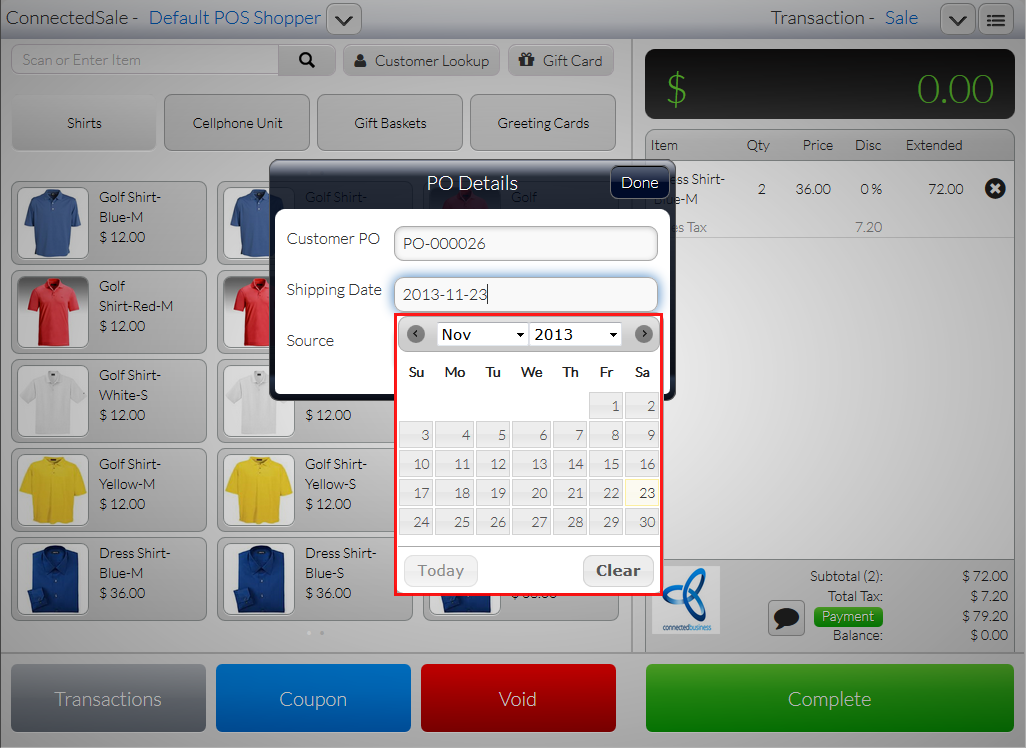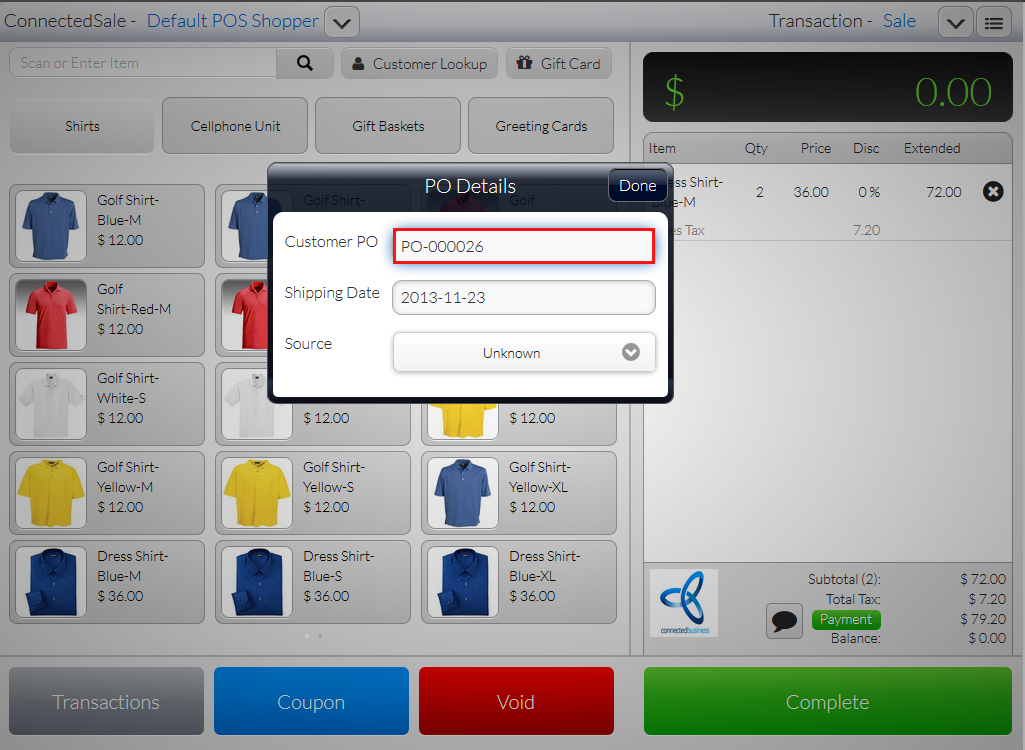 Customer PO is usually added when making business to business sales transactions in the Connected Business backend. With the Connected Sale Mobile POS, you can now directly enter the Customer PO in the POS application without having to go to the backend.