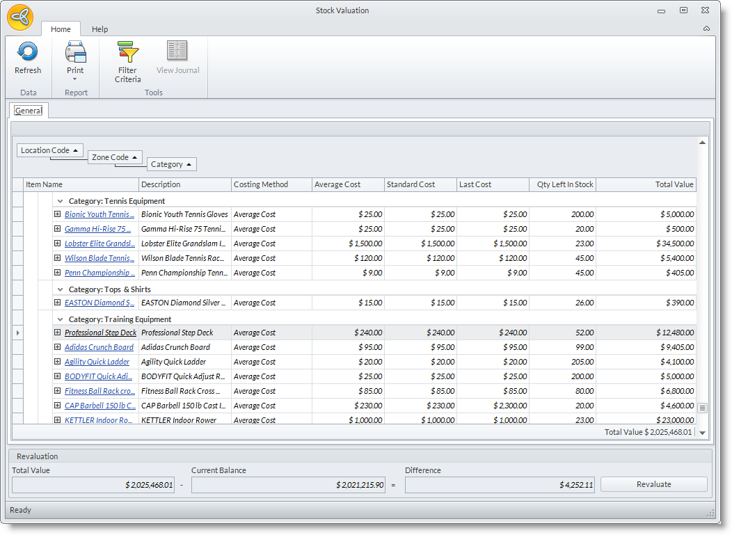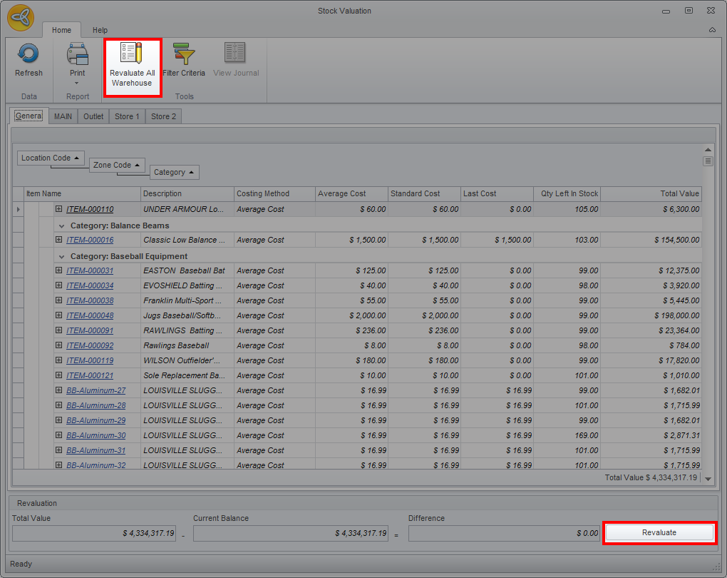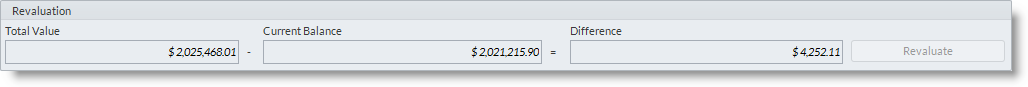 - Click the Revaluate button to revaluate the stock values. After clicking the revaluate button the difference should revert back to zero.