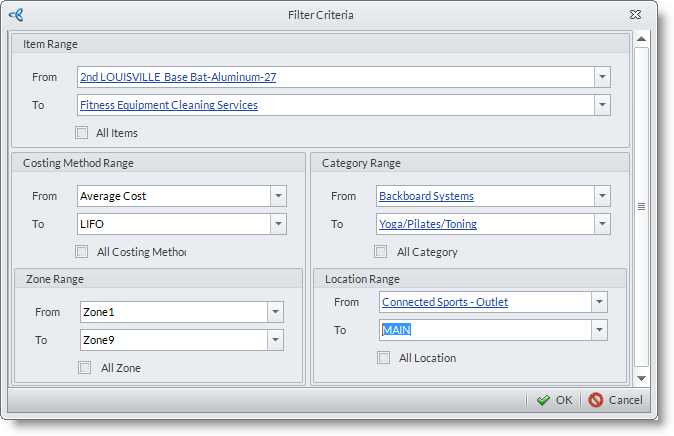 - Zone Range – the range of location zones. You can either select a specific item(s) or select All Zones by ticking the checkbox.
