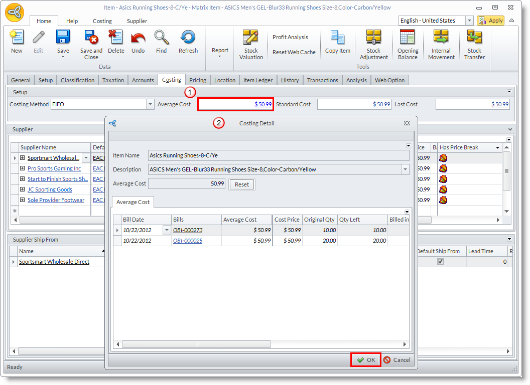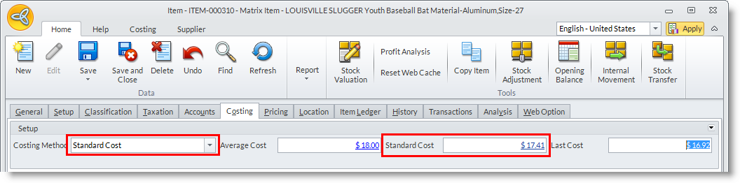 - Shown in the image below are the details to an Average Costing item. You can drill down to the Average Cost value to display the Average Cost history form.