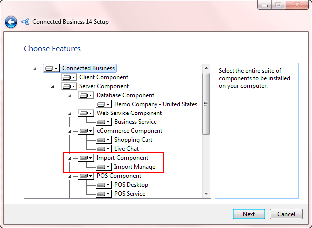 Starting with Connected Business v14, the Import Manager will no longer be installed automatically with the application. It is now added as a feature that can be optionally installed by the user upon installing Connected Business.