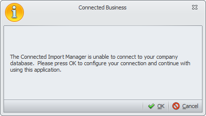 If no configuration is made and you decided to just go ahead and run the Import Manager, a message prompt will be displayed indicating that the application is unable to connect to your company database. Click OK to load the configuration tool or click Cancel to close the Import Manager window.