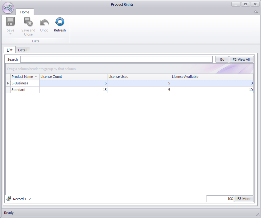 - On the Detail tab, select a Product Name, then add users from the Existing Users list to the Selected Users list to allow them to use that product.