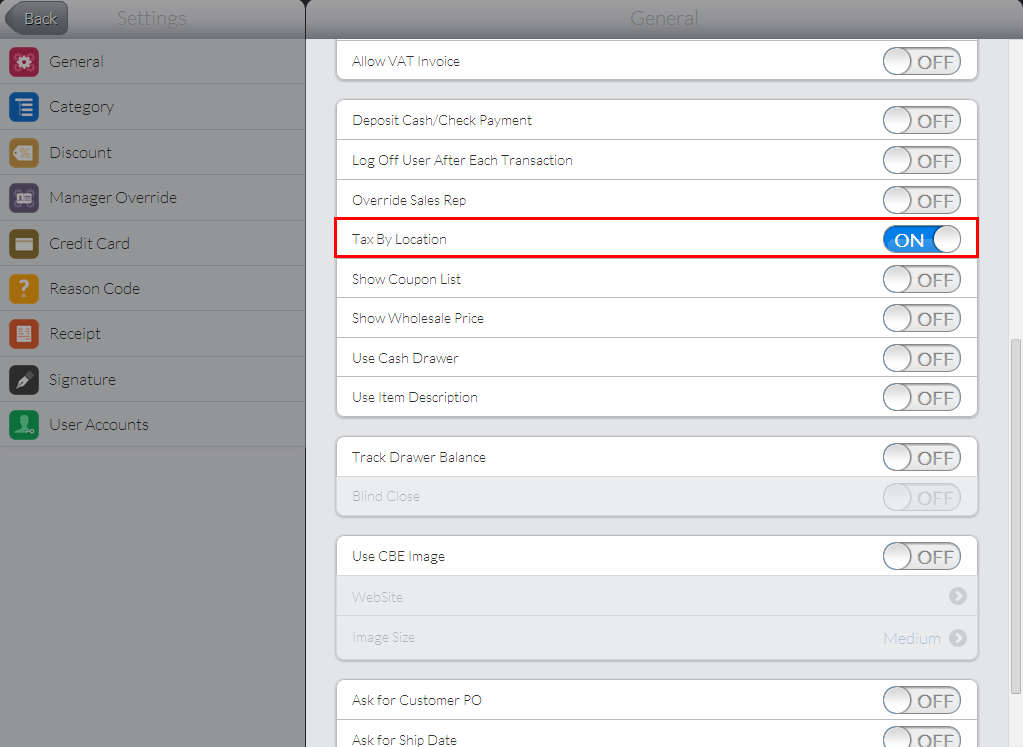 If this option is enabled, the tax term for all POS transactions will be based on the defined tax term of the default location set up in the workstation and not the tax term set up for the customer. To enable Tax By Location,