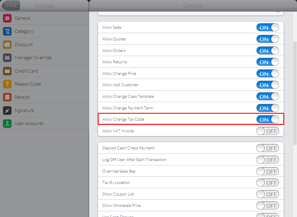 - Set Allow Change Tax Code to On. Tap Back to return to the dashboard and apply changes.