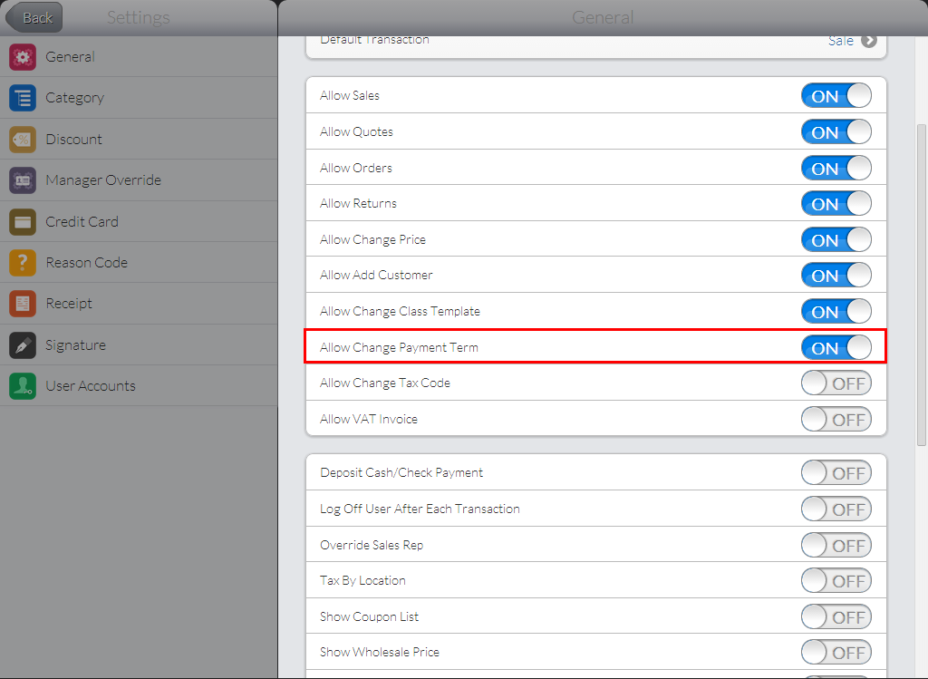 - Set Allow Change Payment Term to On. Tap Back to apply changes and return to the dashboard.