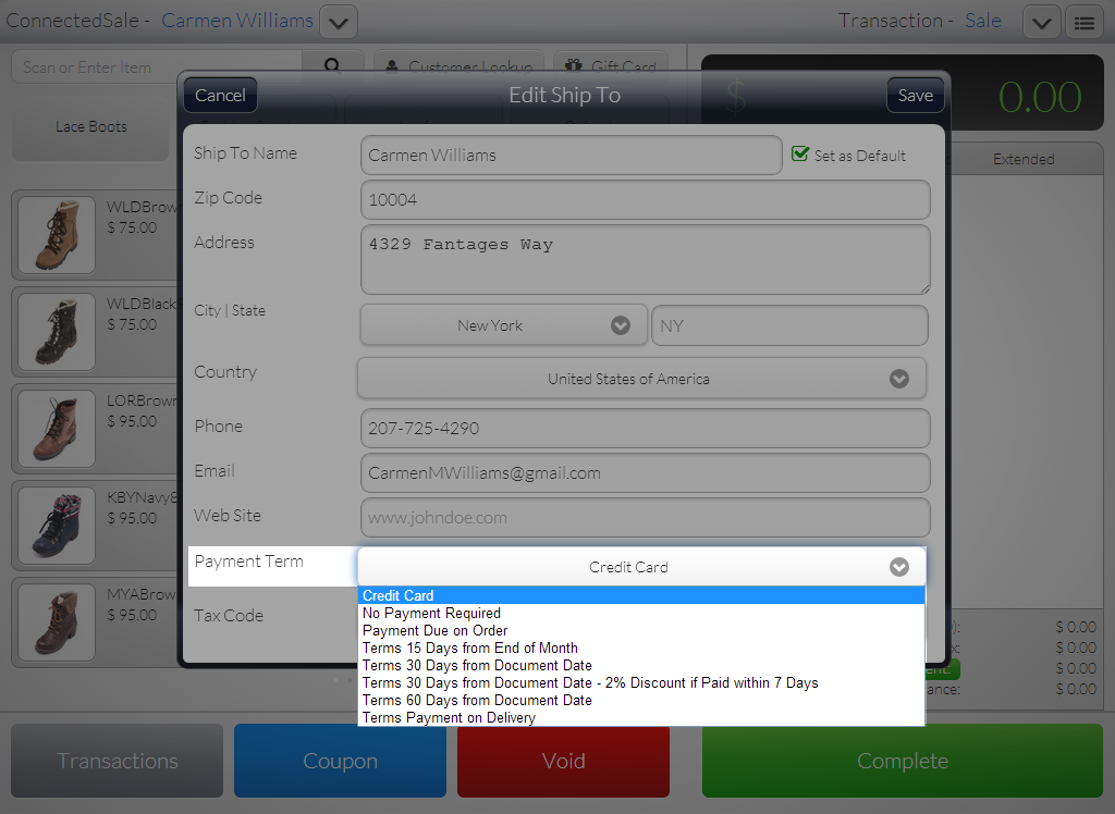 Tax Terms determine the tax rate applied to a transaction. Payment Terms define the agreed upon terms of payment between the seller and buyer. In previous versions of Connected Business POS, the tax and payment terms are automatically set based on what is defined in the class template assigned for new and exising customers. Once assigned, the tax terms and payment terms cannot be changed.