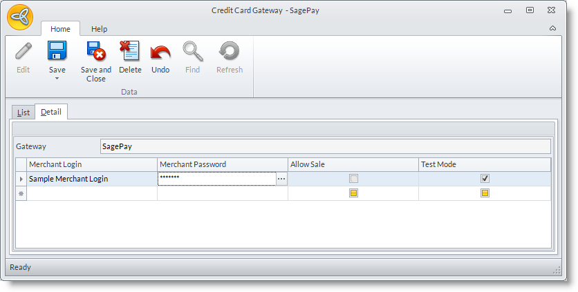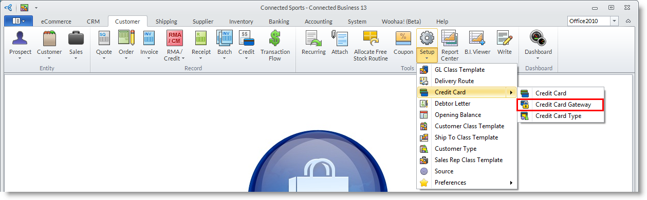- Open the Interprise Solutions application. Go to Customer > Setup > Credit Card > Credit Card Gateway. (You can also access the credit card gateway form from Banking > Setup > Credit Card Gateway). The list of credit card gateways will be displayed.