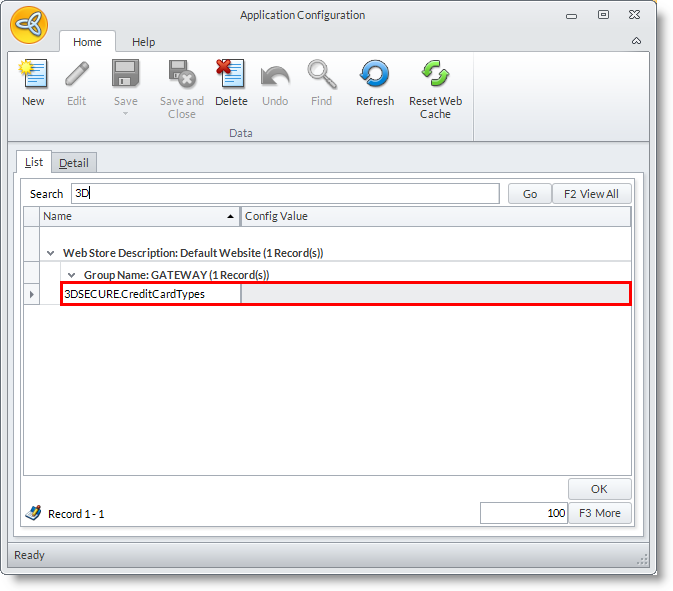 - Assign the credit card type you want to be processed using 3D secure connection. Go to eCommerce > Setup > Application Configuration and search for “3DSECURE.CreditCardTypes” appconfig. Enter “Visa” in the config value field and save your changes.