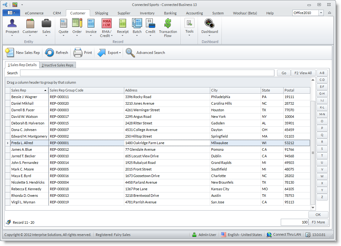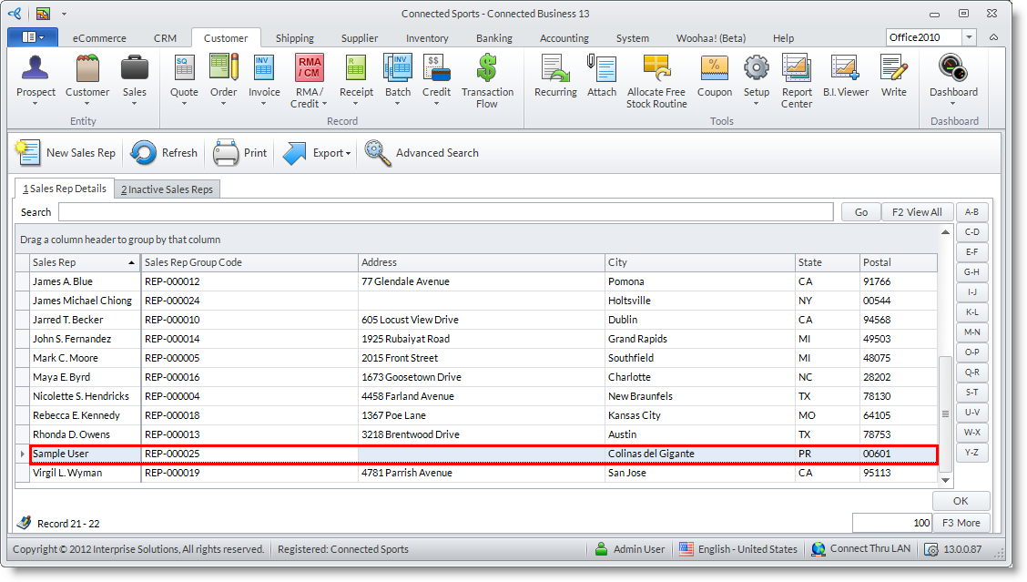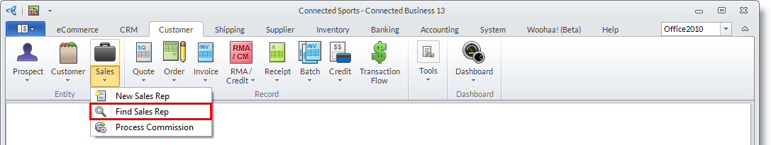 - From the Customer Module > Sales > Find Sales Rep.