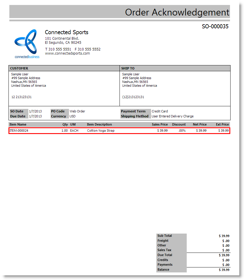The item ordered will also be displayed in the Inventory tab inside the Sales Rep tab. The information listed under the tab refers to the item purchased from the webstore using the modified URL for the Sales Rep. - Click Save and Close to save your inputs.