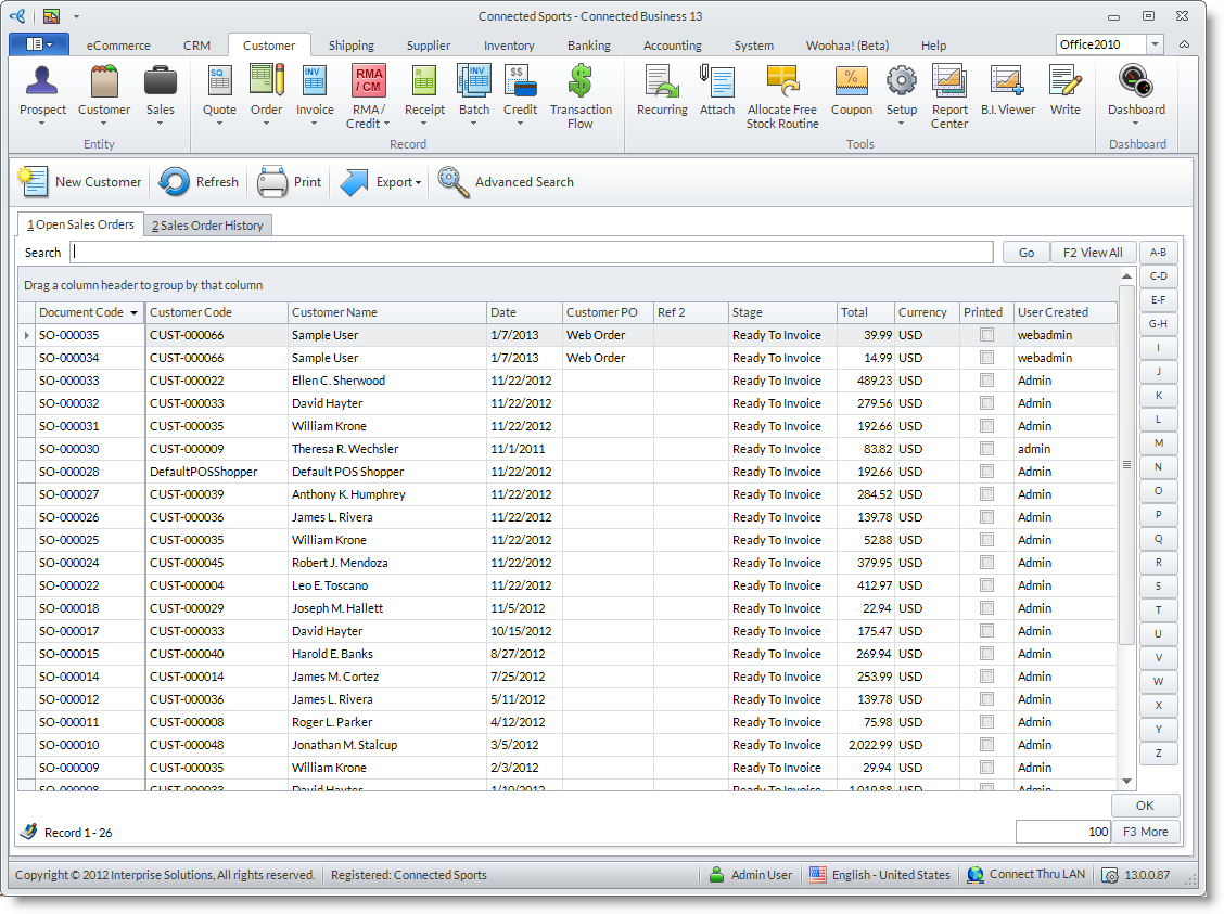 Select from the list the Sales Order you made from the webstore, either by checking the Customer PO column if the entry is logged as a Web Order, or by cross-checking the online receipt's sales order with the sales order codes from the Document Code column. - This will display the Sales Order form. From the Sales Rep tab, the Sales Rep Group and the Contact fields will be displayed. These are the information of the Sales Rep from the modified webstore URL we listed above.