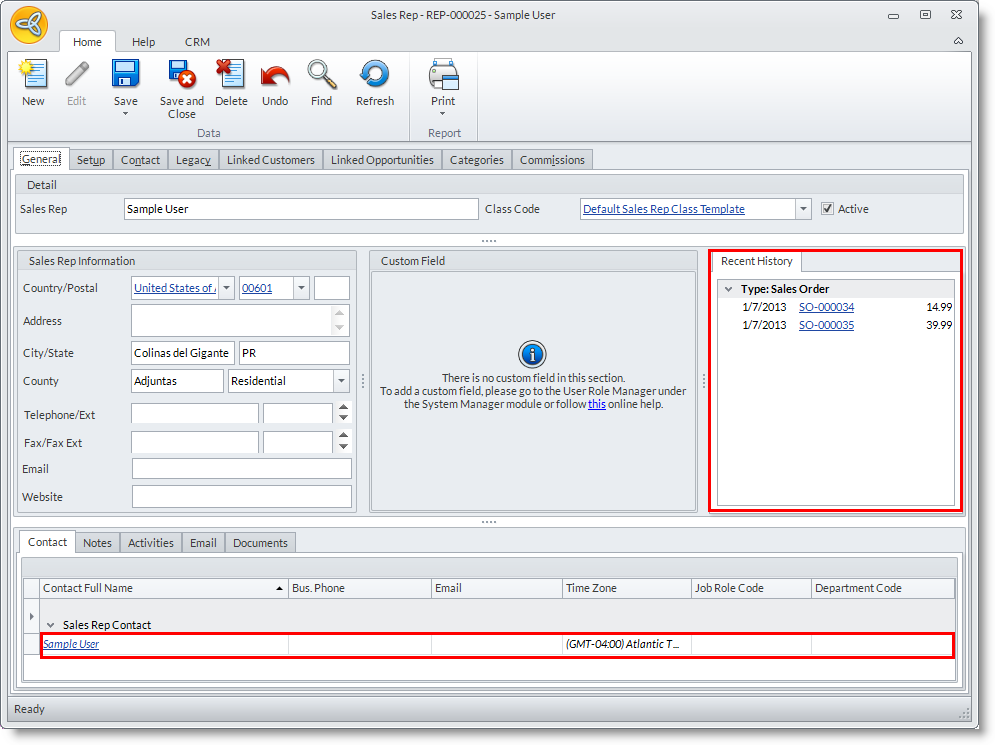 - From the General tab of the Sales Rep form, you will see from the Recent History section the sales orders tied to the Sales Rep information.