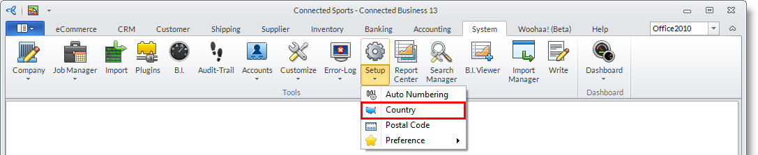 - Go to the System Manager Module. Under the Tools > Setup drop down list, click the Country button.