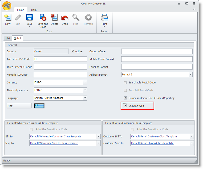 Note: Take note that this must be done for all the countries that you do not want to be visible in the store. - In the specifications window, uncheck the Show on Web checkbox. This makes the country not visible in the store site yet still usable in Connected Business.