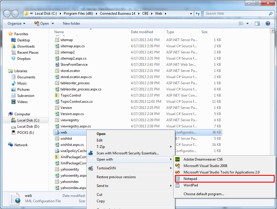 - Open the Web.Config file for editing.