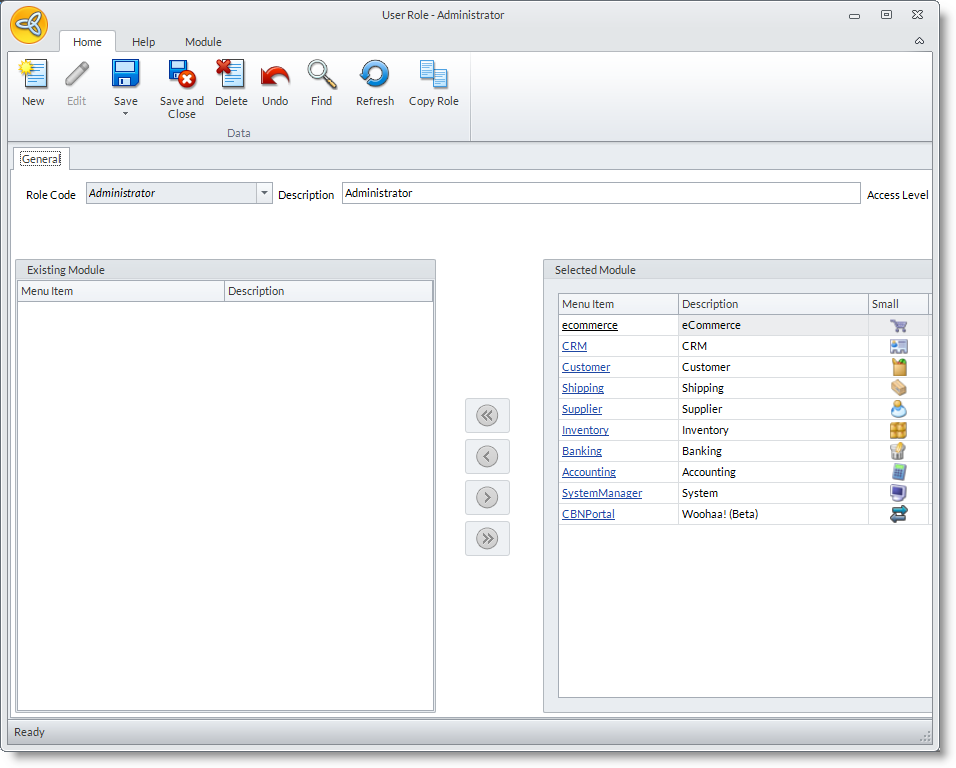 - On the User Role form, select a module that you want to add a tooltip from the Selected Module section.