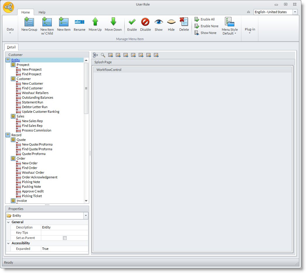 - On the User Role editor form, select a form entry from the Detail tab. Note that User Role customization does not apply to entities that is derived from a wizard such as prospects, customers, etc.