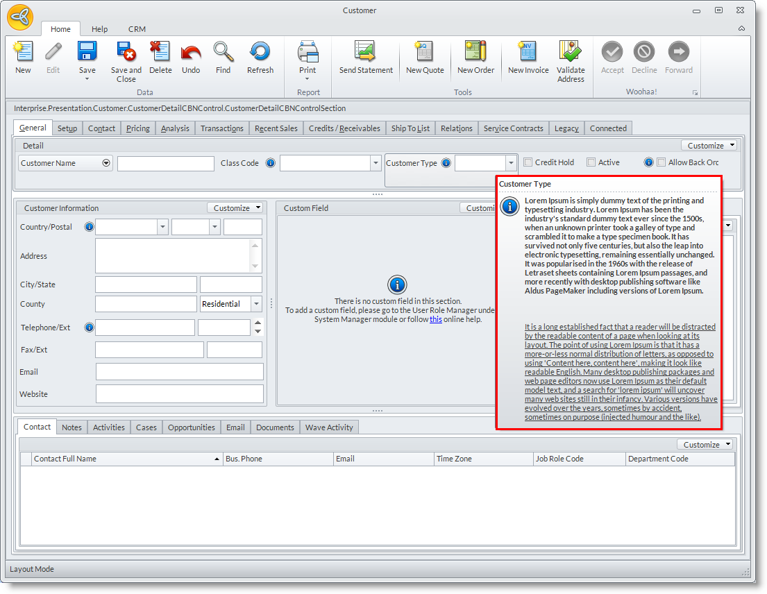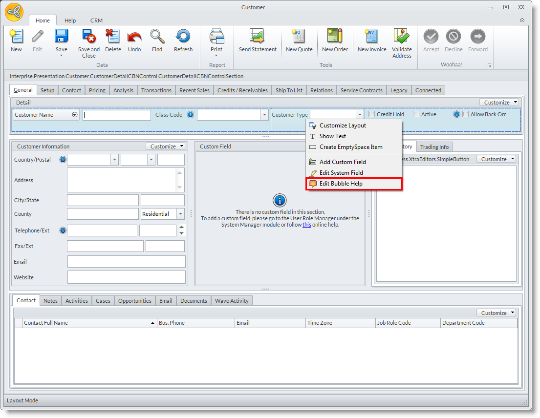 If the Bubble Help Editor is left blank, or if its contents is the same as the selected field (e.g. Customer Type), no tooltip icon will be displayed beside the selected field.