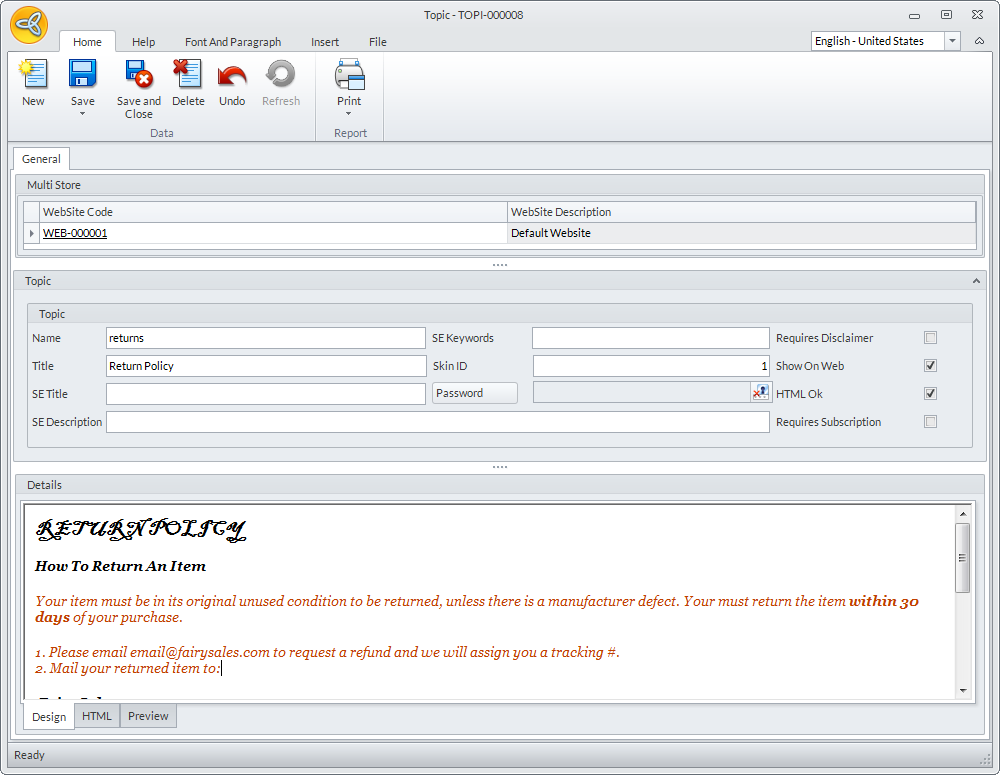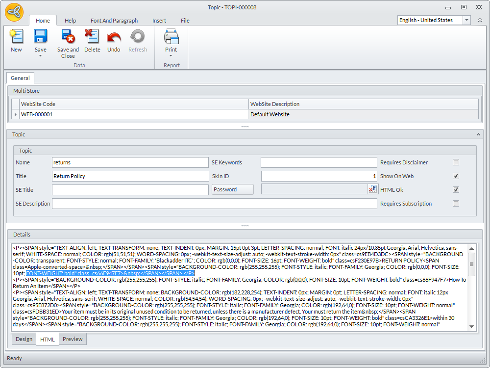 This option, when enabled in a certain topic, limits it accessibility to those users that has a valid subscription to the store site. This a necessity for those stores that caters web contents to its customers. - On the Details section, start designing the topic by selecting which tab to use. You have the preference to perform this in Design mode or HTML codes.