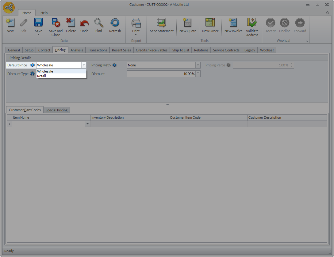 For wholesale customers to see the item price and Add To Card button, the customer default price must be wholesale. To set this, go to the Customer module > Customer > Find Customer. Select the customer record from the list to open the Customer Detail form. In the form, go to the Pricing tab and set the Default Price to Wholesale.