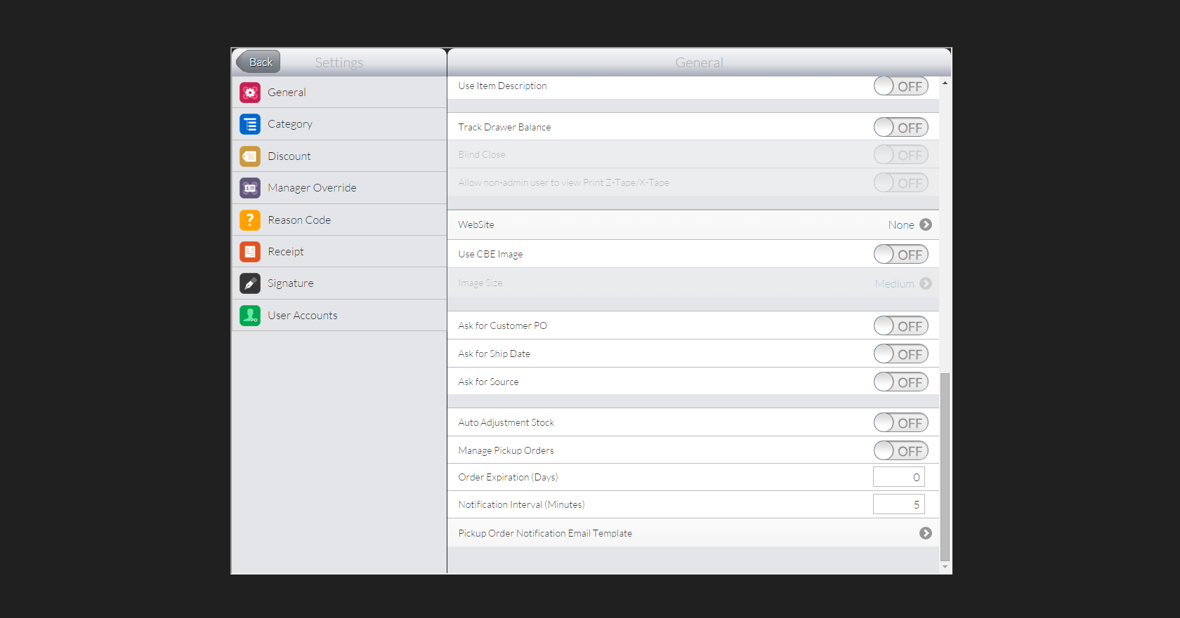 | Notification Interval Minutes | Controls the frequency with with POS will request an update from the Connected Business database, including newly created pickup notifications. |