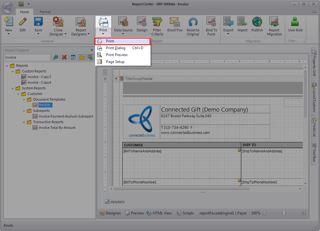 - Edit the report template as needed. Once done, click the Print dropdown arrow, then select Print to proceed with the direct printing.