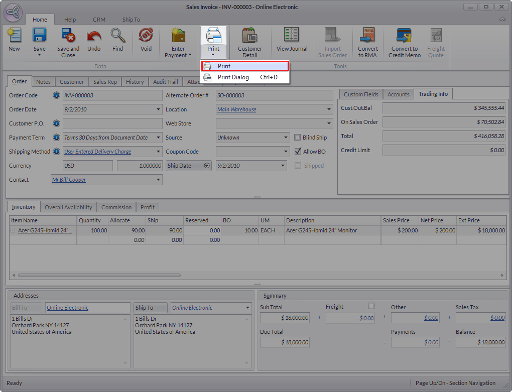 Users can also perform silent printing straight from Connected Business’ forms (e.g. Sales Invoice form). To do this: