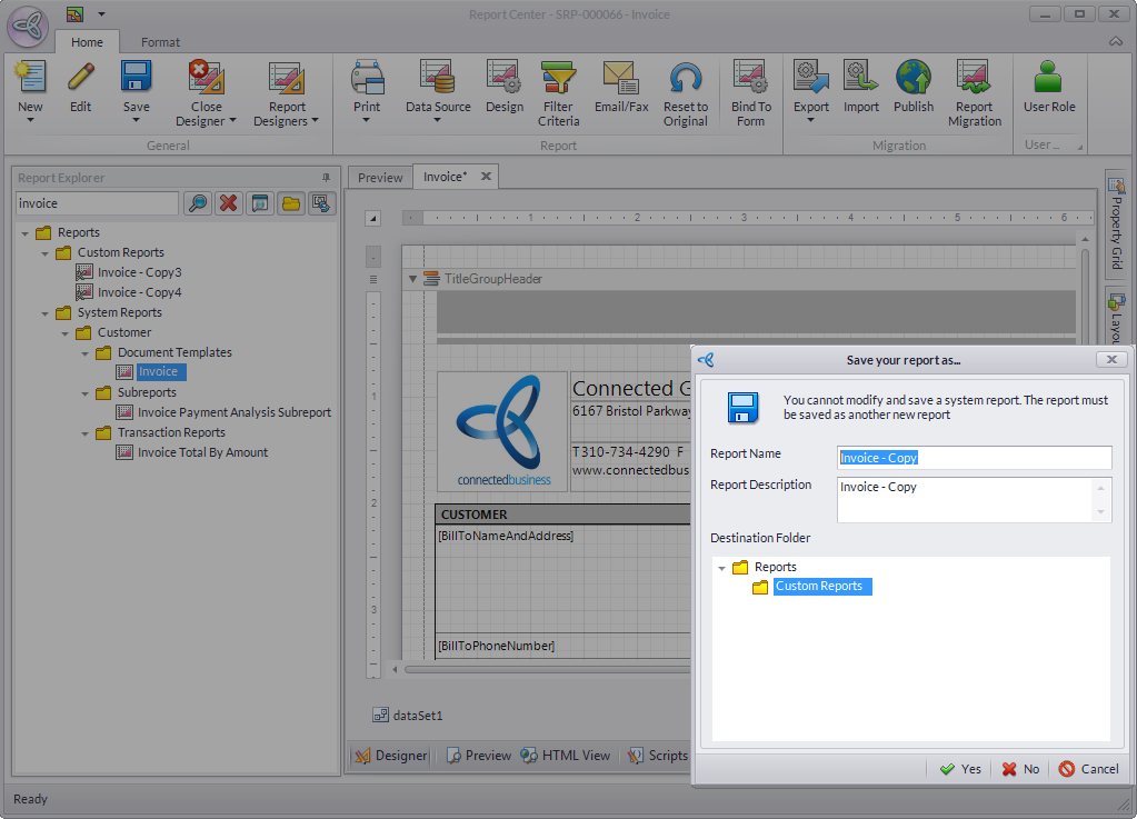- By clicking Yes, the system will create a copy of the edited report, and will be saved to the Custom Reports folder.