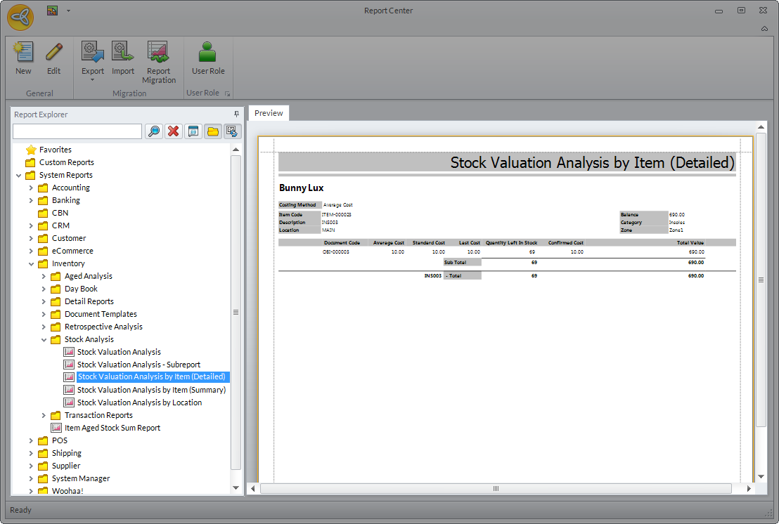 The Stock Analysis by Item report shows the remaining quantity in stocks for a specific item as well as the costing method and transactions related to the item. You can access the Stock Analysis by Item report from the Report Center menu of any module in Connected Business. Click the Report Center menu to load the Report Center window. In the Report Explorer panel, click Reports > System Reports > Inventory > Stock Analysis > Stock Valuation Analysis by Item (Detailed).