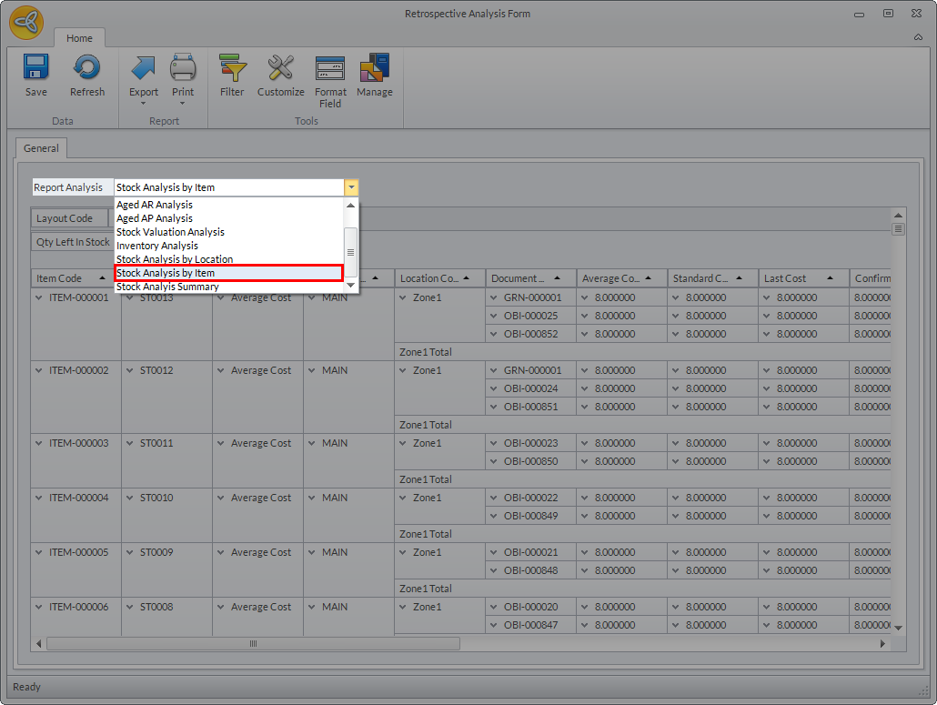 You can also view this report from the Retrospective Analysis form. Go to Accounting module > Retrospective Analysis. In the form, select Stock Analysis by Item from the Report Analysis dropdown list.