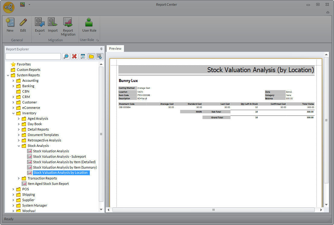 The Stock Analysis by Location report shows the remaining quantity in stocks per location as well as the costing method and stock transactions for all items.You can access the Stock Analysis by Location report from the Report Center menu of any module in Connected Business. Click the Report Center menu to load the Report Center window. In the Report Explorer panel, click Reports > System Reports > Inventory > Stock Analysis > Stock Valuation Analysis by Location.