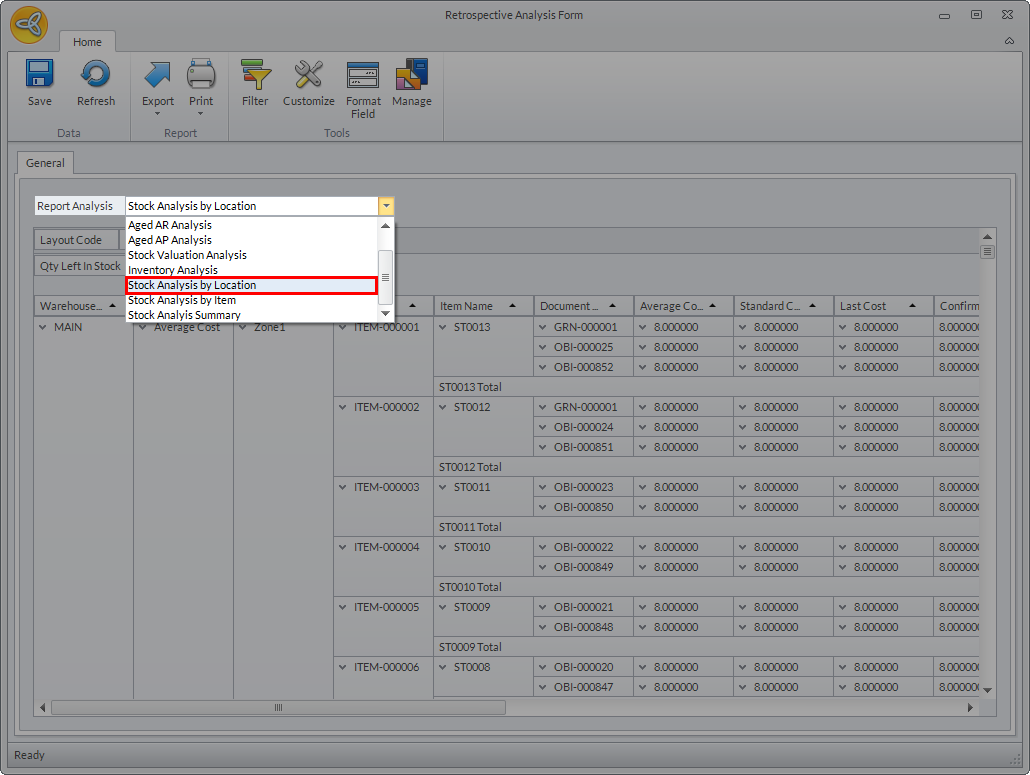 You can also view this report from the Retrospective Analysis form. Go to Accounting module > Retrospective Analysis. In the form, select Stock Analysis by Location from the Report Analysis dropdown list.