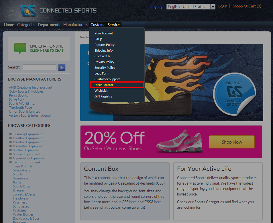 You can access the Store Locator directly from the Customer Service menu of the webstore.