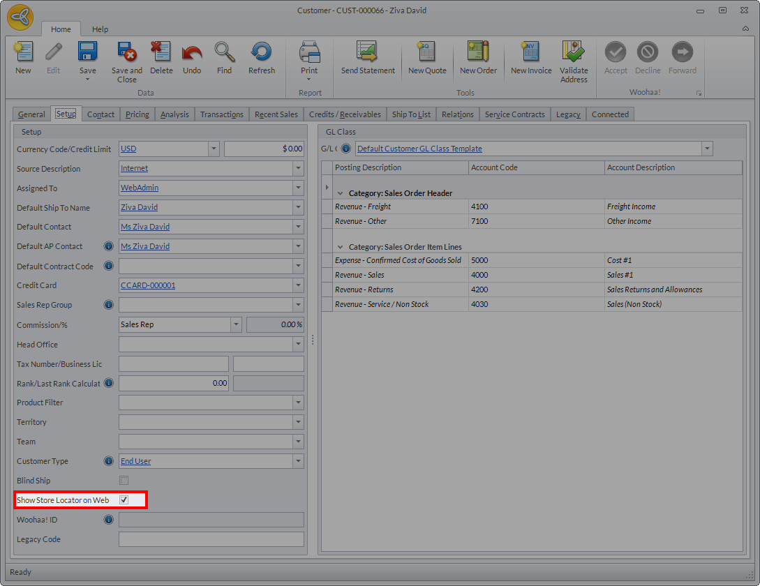 - Dealer – For a dealer to be searchable, he/she must be listed as a customer in Connected Business and the option to be viewed in the Store Locator Map should be enabled. To do this, go to Customer module > Customer > Find Customer and select customer from the list. In the Customer Detail form, click on the Setup tab and tick the checkbox right next to the Show Store Locator on Web option.