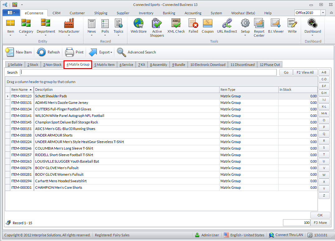 - From the Item List, access the Matrix Group tab to view only the Matrix Items in your inventory.
