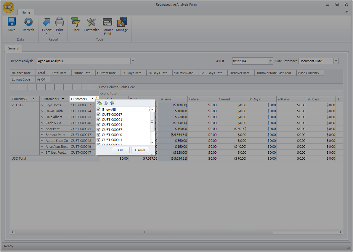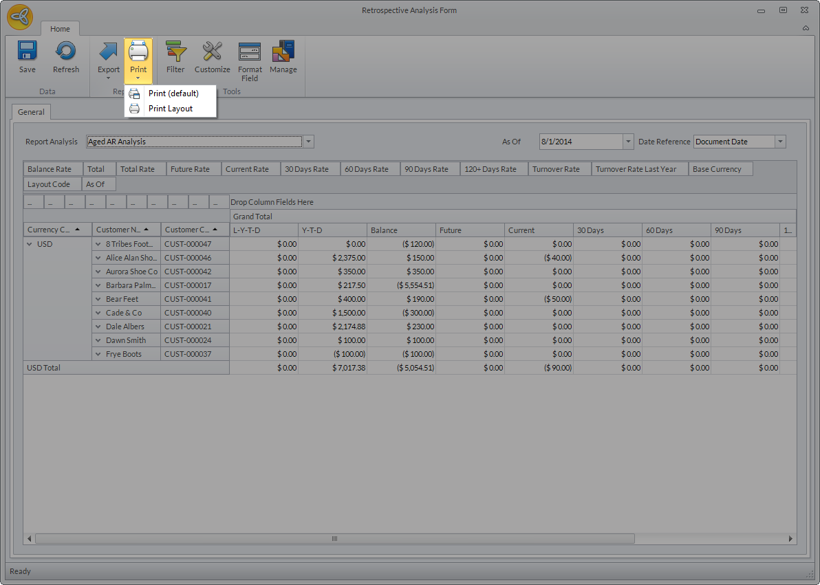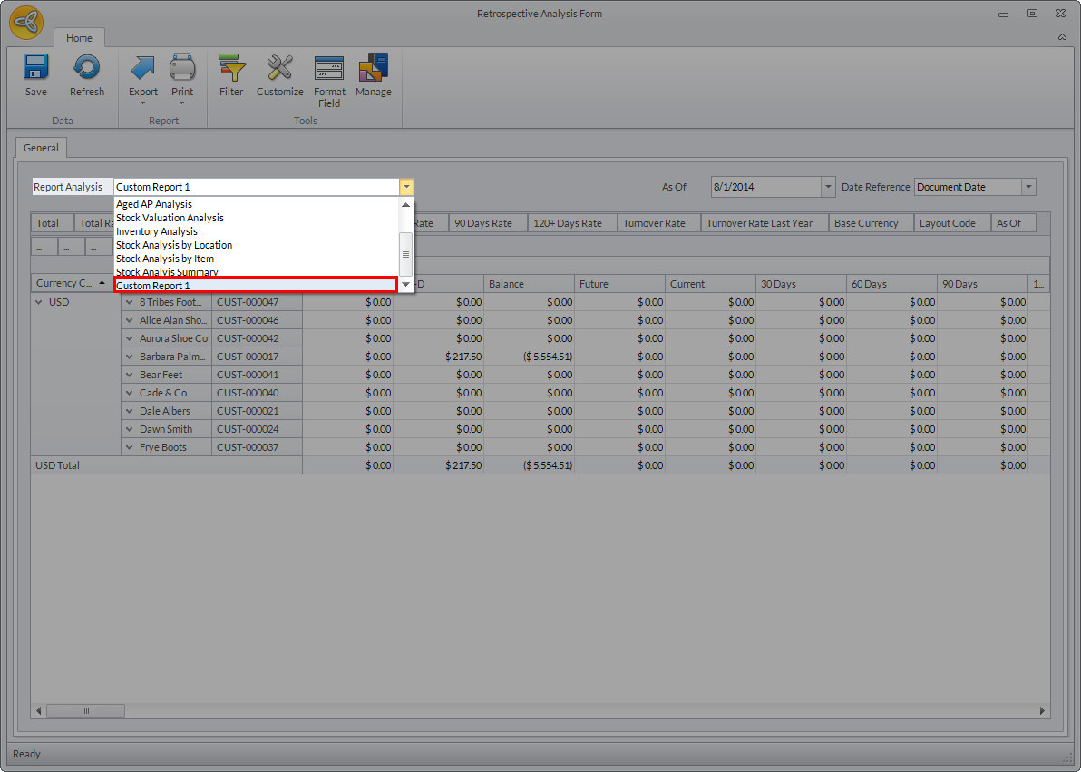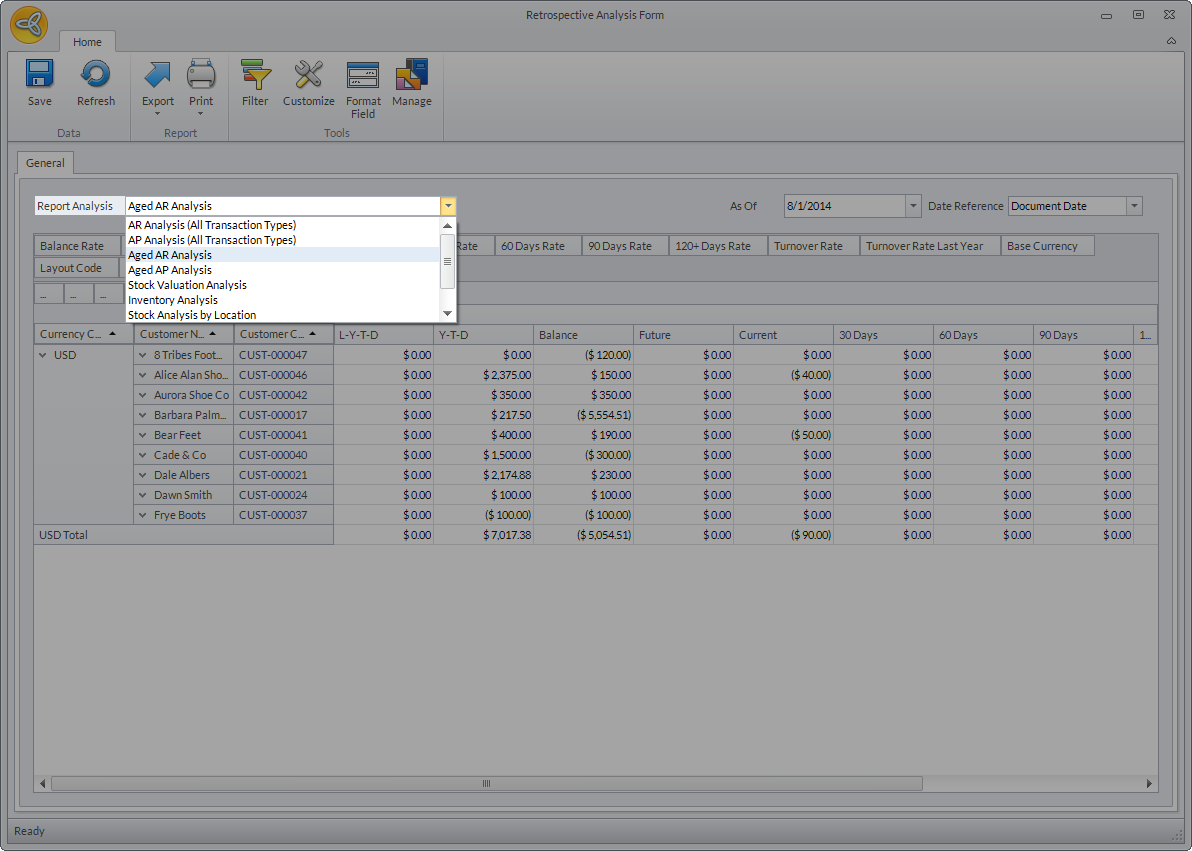 Upon opening the form, the default report displayed is the Aged AR Analysis. You can view the list of all default report layouts by clicking on the Report Analysis dropdown. Select the report layout you want to view to load the report data.