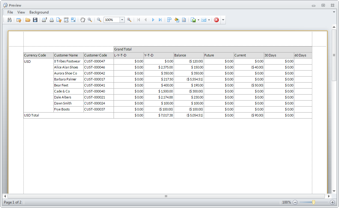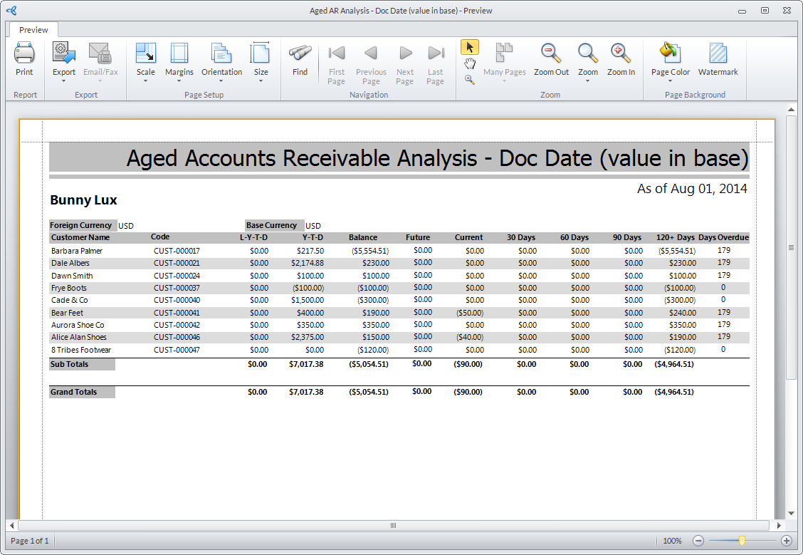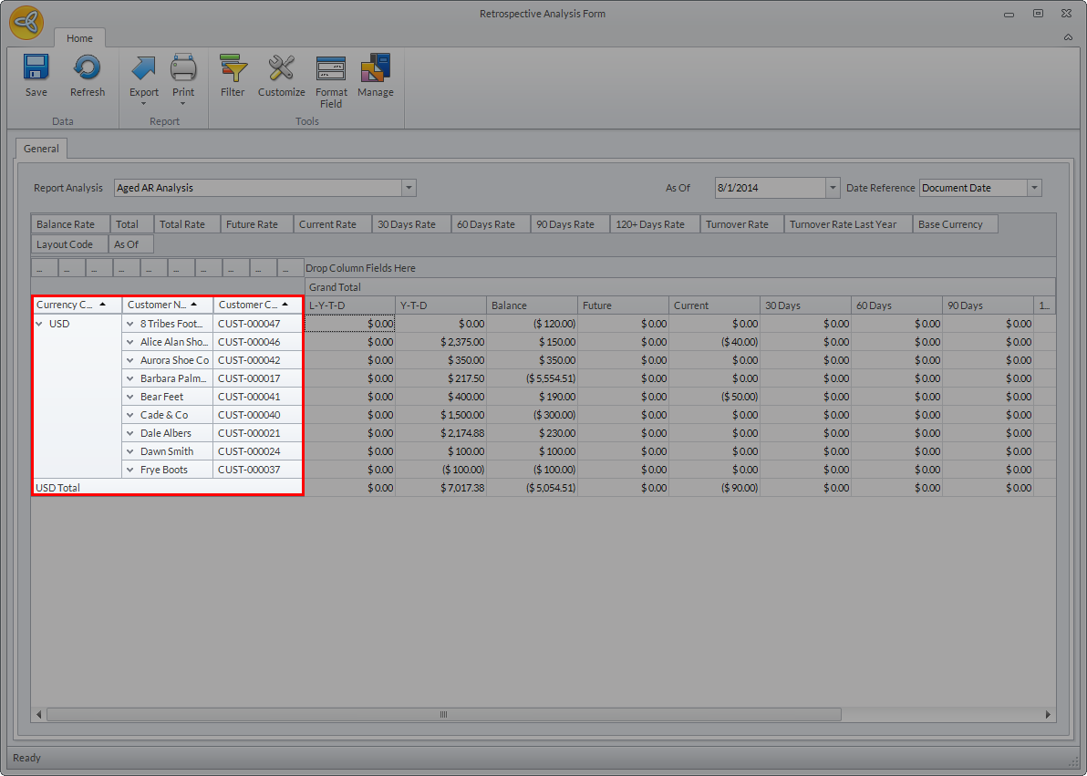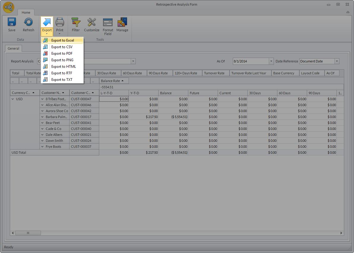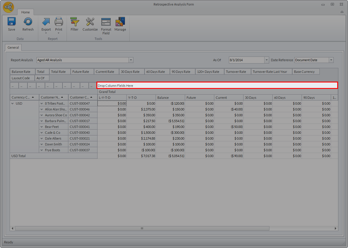 Upon opening the form, the default report displayed is the Aged AR Analysis. You can view the list of all default report layouts by clicking on the Report Analysis dropdown. Select the report layout you want to view to load the report data.