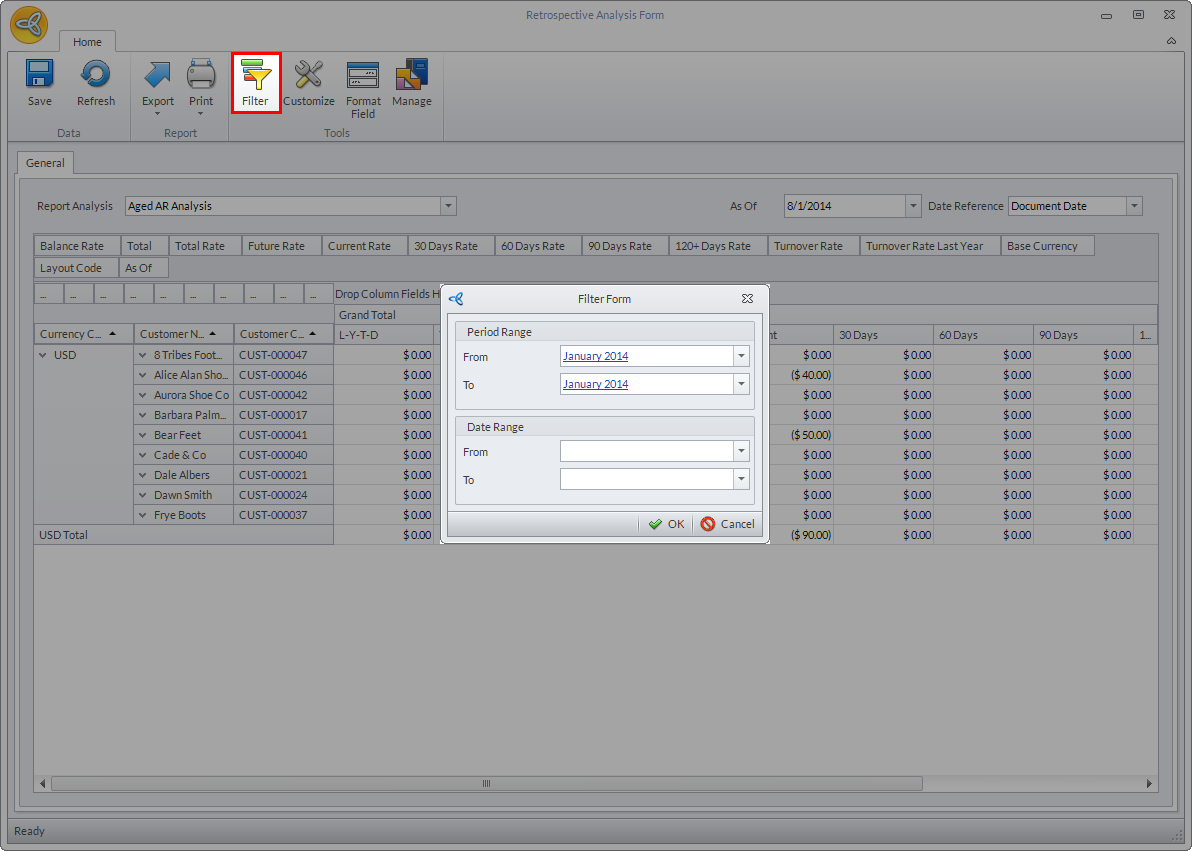 - Define the filter criteria by entering the values in the From and To fields in the Period or Date Range sections.