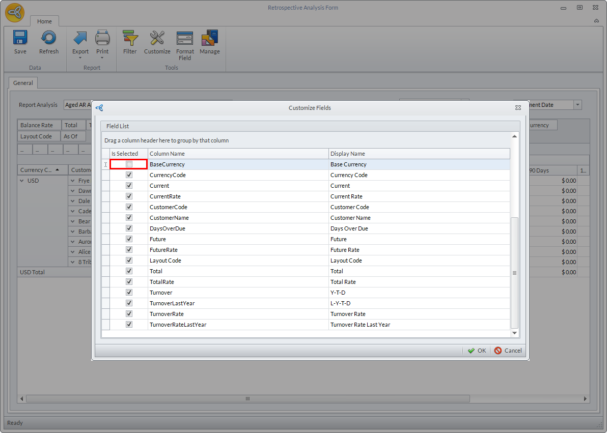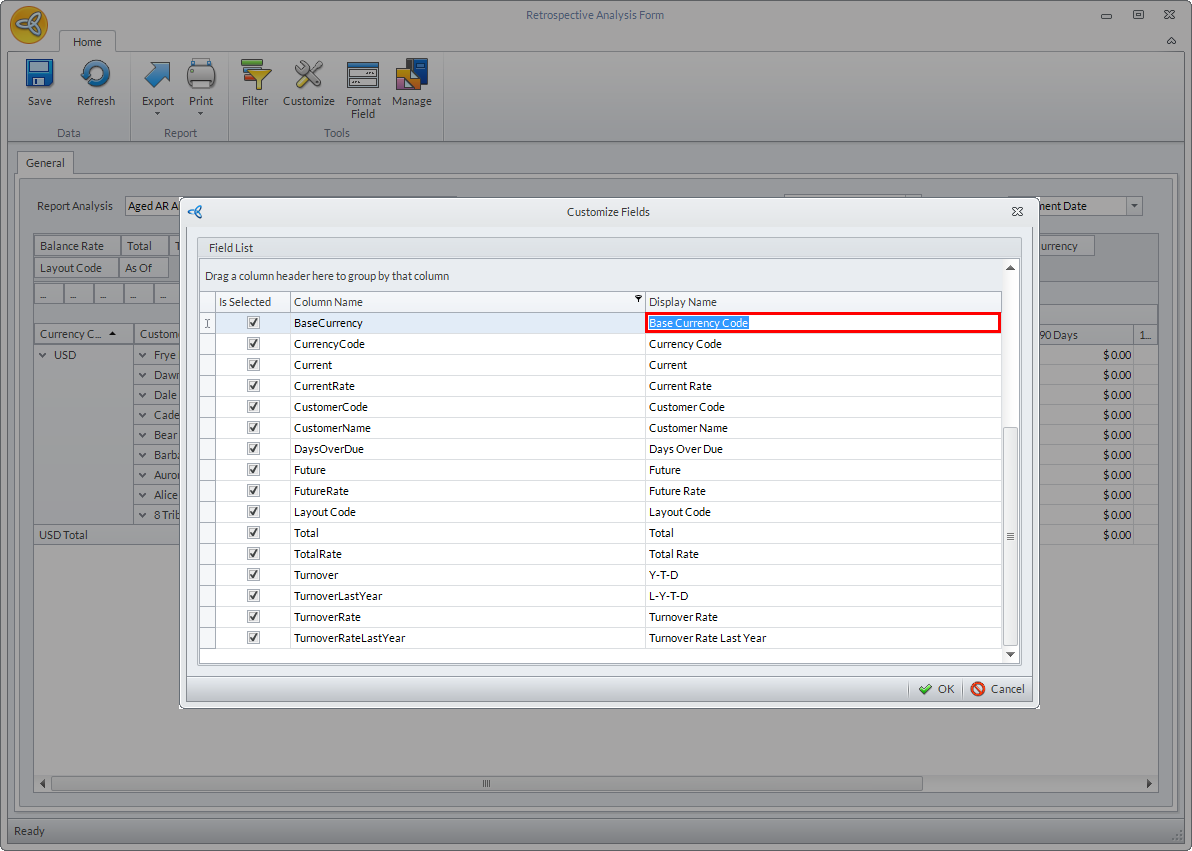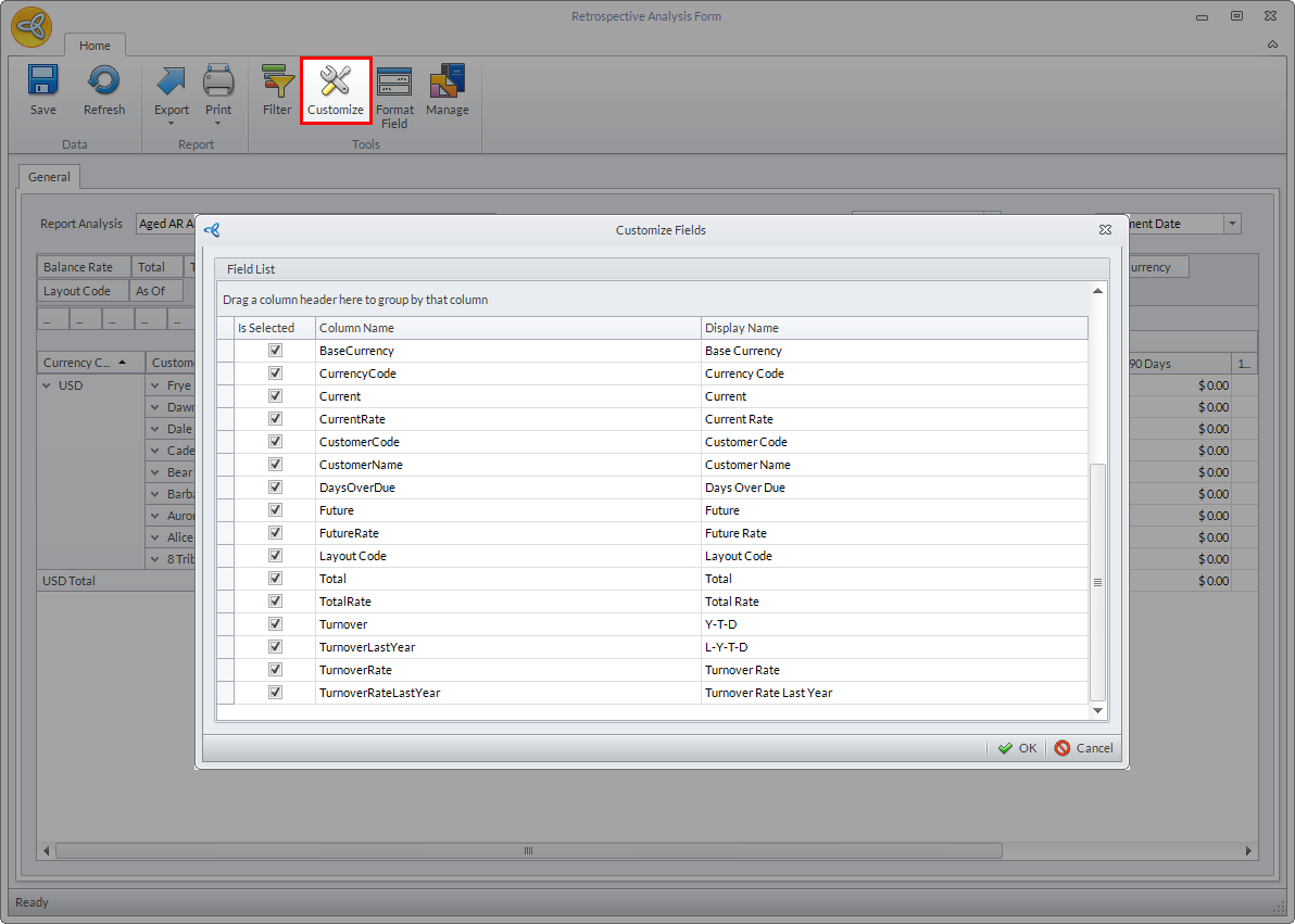 - Click the Customize button. The Customize Fields Form will be displayed with the list of predefined fields for the currently active layout.