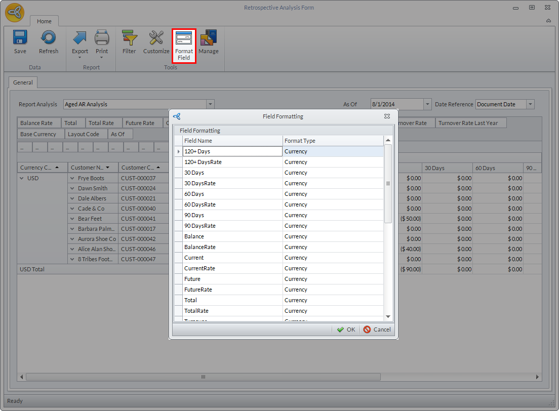 - Click the Format Field button. The Field Formatting form will be displayed with the list of fields for the currently selected report layout.