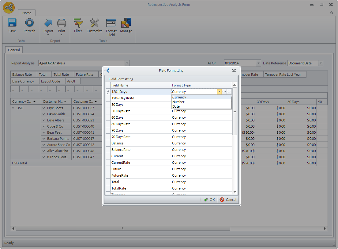 - Set the format type for each field by clicking on the arrow down icon from the Format Type column. You can select from the following format types: Currency, Number, or Date.