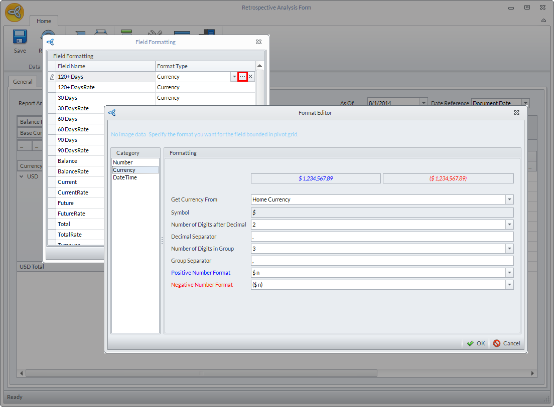 - In the Format Editor form, select the format type from the Category panel to view the formatting options. In the Formatting section of the selected format type, define the values for formatting as needed then click OK.