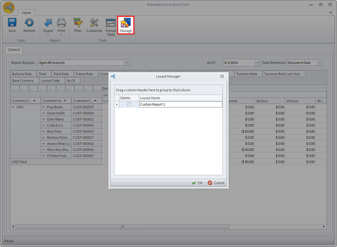 - Click the Manage button. The Layout Manager form will be displayed with the list of custom reports.