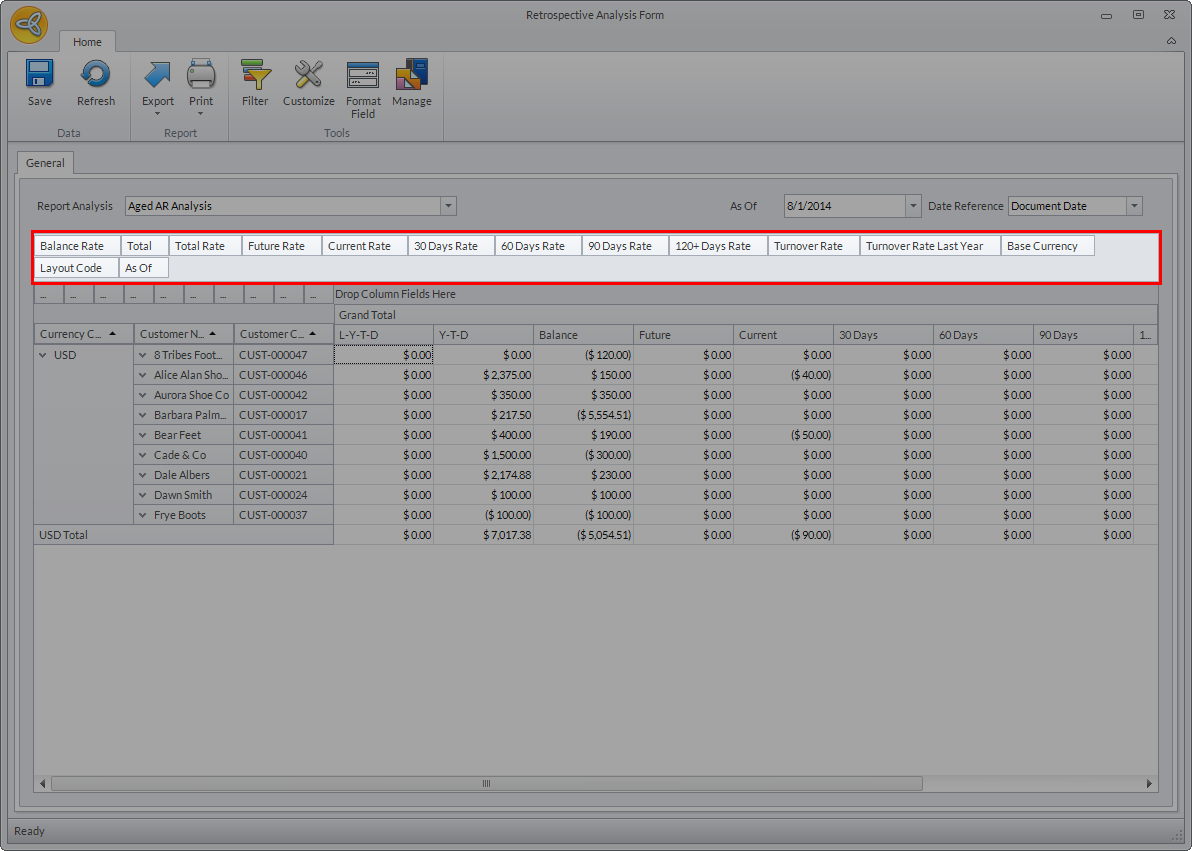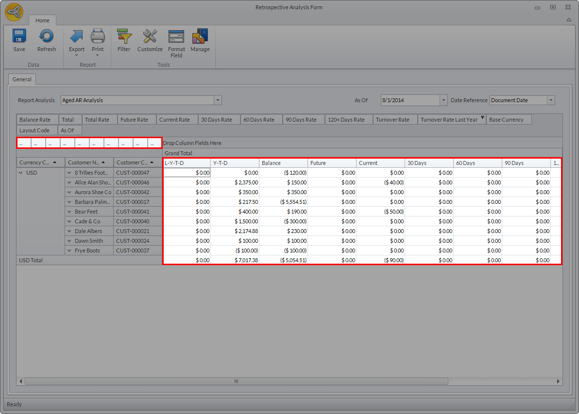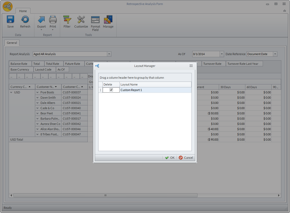 - Select the layout from the Report Analysis dropdown list (e.g. Aged AR Analysis).