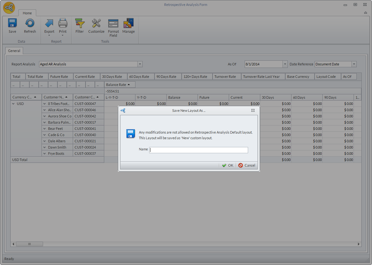 The Retrospective Analysis Form allows you to get different views or layouts for your analysis reports in a Business Intelligence format. Each layout has a set of predefined fields which you can use to set how the data is presented in the report according to your needs. Aside from setting the layout view, you can also create your own custom report layout and export it in different file formats. The Retrospective Analysis form can be accessed from the Accounting module > Retrospective Analysis.