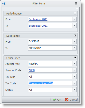 - Set the filter for the records by using the Filter pane. Click the Filter button to activate it. You can choose to filter the records according to period range, date range, journal type, account code, tax type, tax code and status.