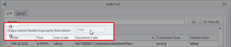 E.g. If you want to group the audit trail logs by date, click and drag the Date column header to the Drag a column header to group by that column area.